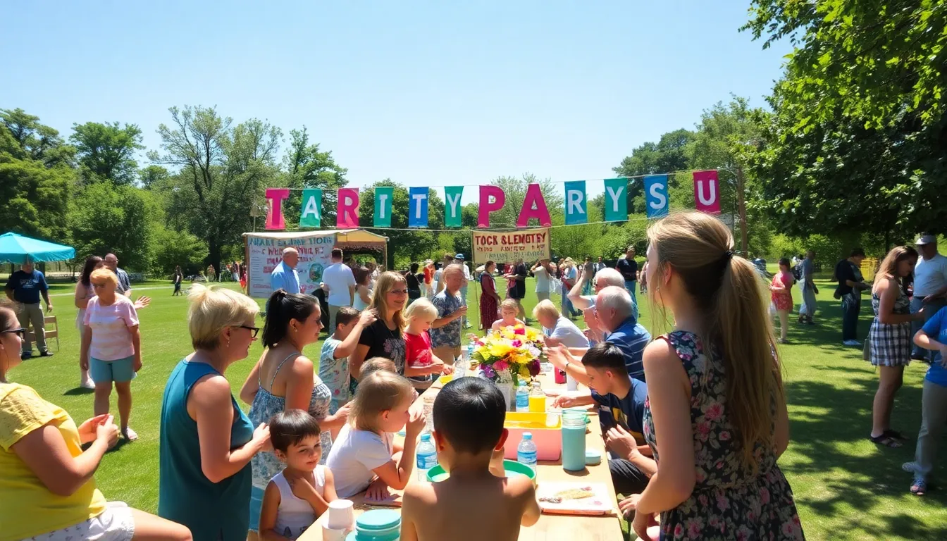 a lively outdoor community gathering with homemade decorations and joyful guests.